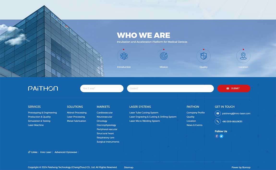 Paithon是一家醫療器械合同制造商,專業從事精密微加工服務,包括激光切割、鉆孔、焊接、形狀設置、表面處理、無心磨削和機械加工。憑借我們自主研發的核心激光系統和不斷發展的工藝開發能力,我們提供業內最新的尖端解決方案。利用先進的模擬技術、廣泛的過程數據庫和性能測試平臺,我們提供由金屬和聚合物材料制成的各種醫療器械,以滿足您在神經干預、外周血管干預、心血管、結構心臟等方面的復雜需求。